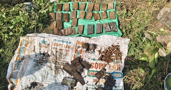 Người dân thực hiện cải táng mộ của gia đình thì bất ngờ phát hiện 600 viên đạn dùng cho súng AR15, hộp tiếp đạn và 2 quả lựu đạn còn ngòi nổ.