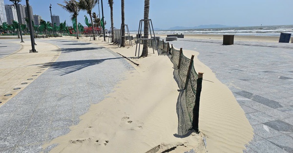 Cát biển bay vào công viên Bãi Sau ở Vũng Tàu dày đặc. Hằng ngày công nhân phải xịt rửa, thu gom cả trăm mét khối cát trong công viên đổ lại xuống biển.