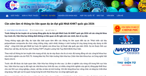 Viện Hóa học khẳng định cán bộ của mình không liên quan tới dự án giải nhất khoa học kỹ thuật quốc gia của nhóm học sinh Ninh Bình và đề nghị cơ quan chức năng sớm làm rõ sự việc, bảo vệ danh dự nhà khoa học.